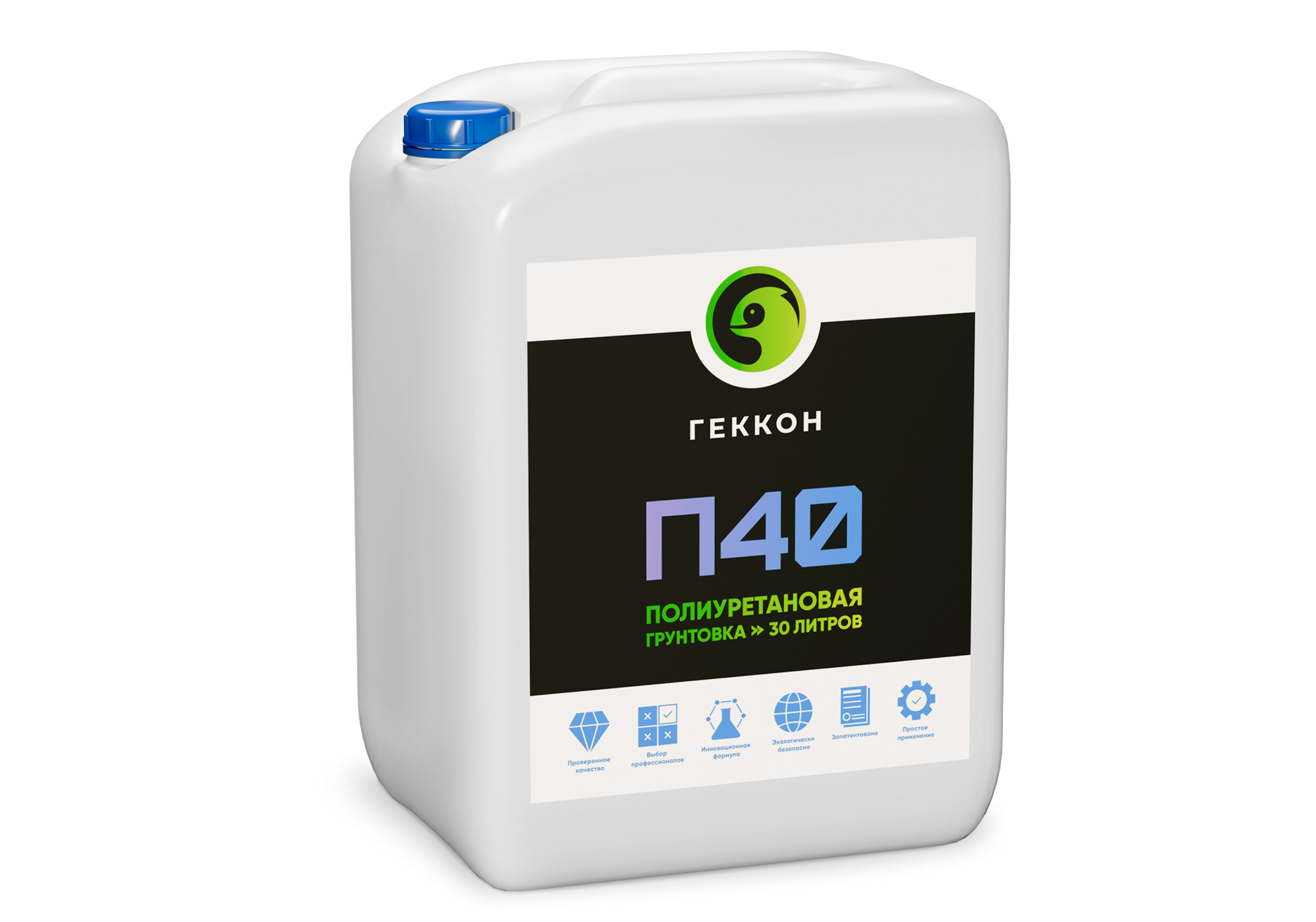 Геккон П40 - Полиуретановая однокомпонентная пропитка (покрытие) наносится на основание многослойно в качестве грунтовки и финишного слоя. Обеспечивает бесшовное водонепроницаемое покрытие, стойкое к химическому воздействию.
